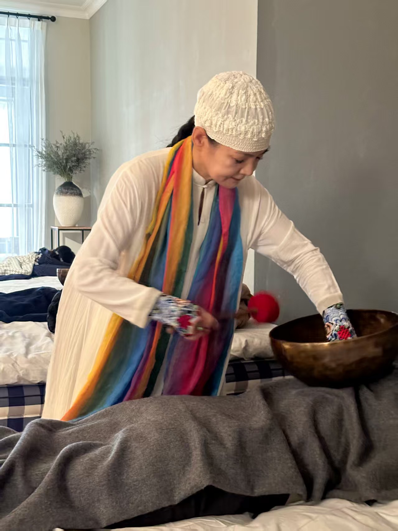 在静谧舒适的蓝白格空间里,丽莎老师不仅引领空灵悠远的钵音流淌,更悉心解析深度睡眠的要素,分享融入日常的舒眠技巧。当沉稳悠长的频率在空气中荡开,时光仿佛变得绵长而轻柔。宾客们闭目聆听,或静坐,或安卧于床具之上,任由声波的频率抚平思维的涟漪,让每一寸身心在专业的引导中,逐渐松弛、舒展、归位。