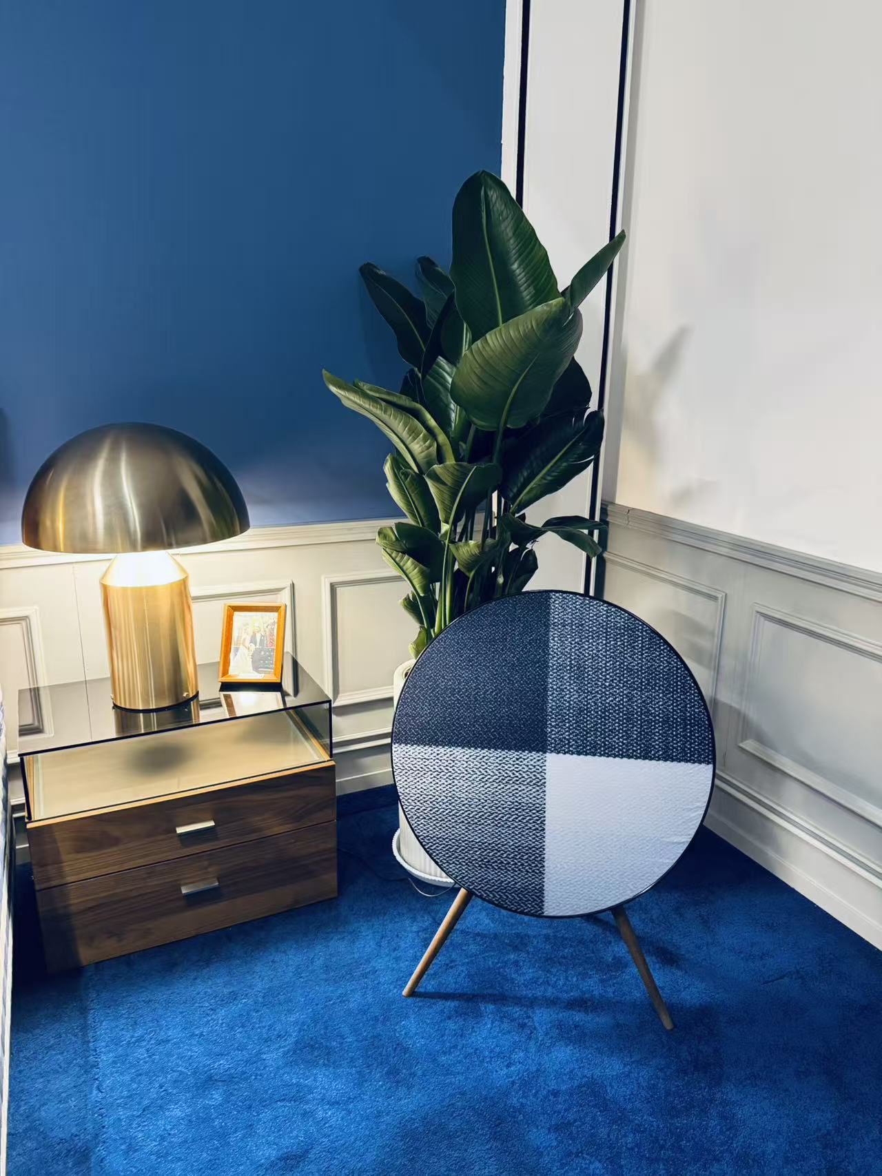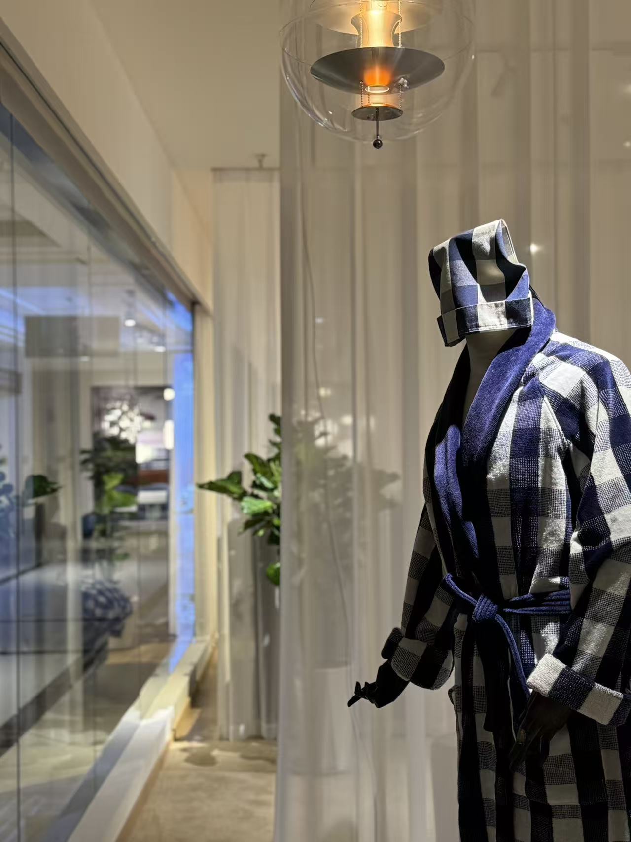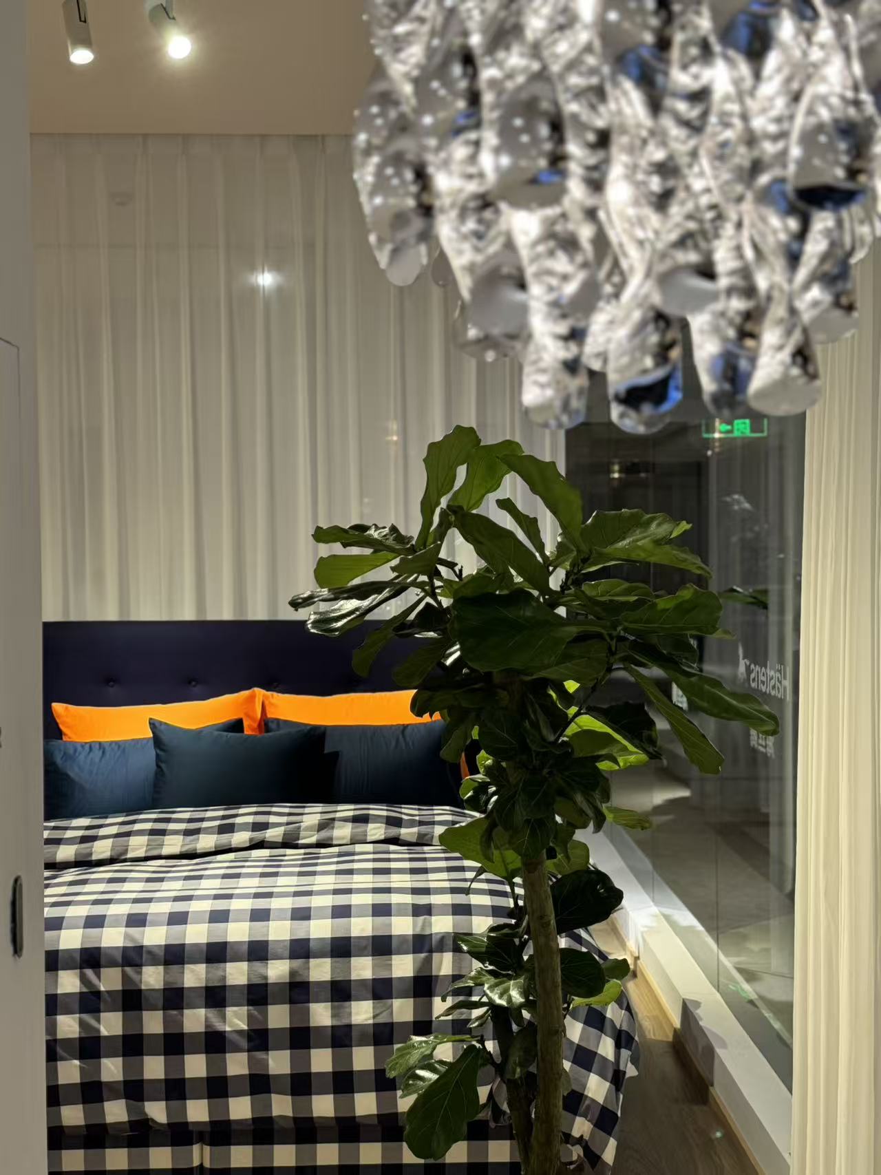 在这里,每一张床具都是一件艺术品,蓝白格纹如西湖的涟漪般延伸,天然材质在灯光下泛着温润的光泽。