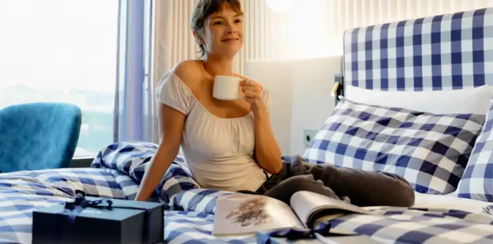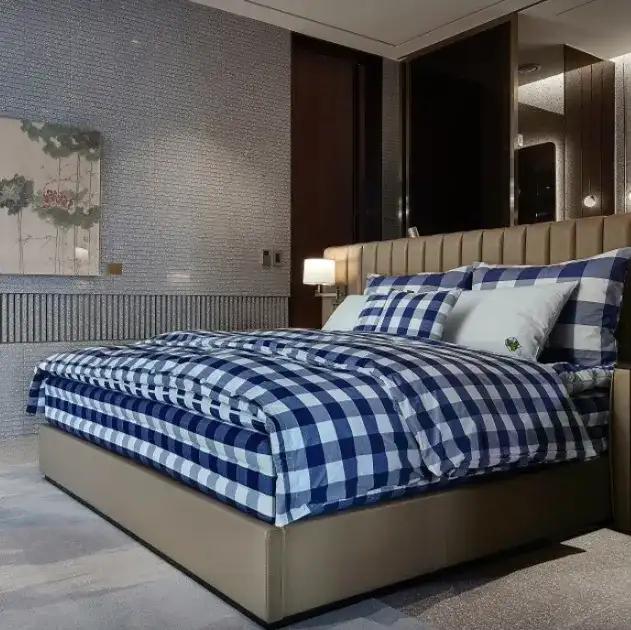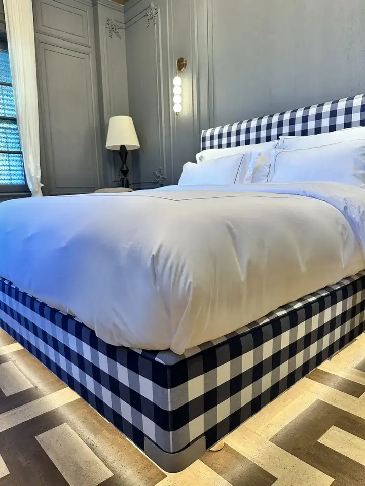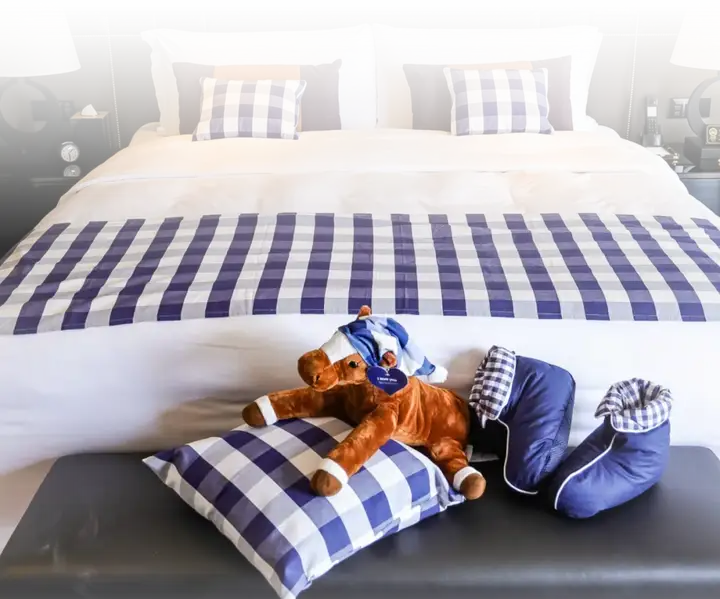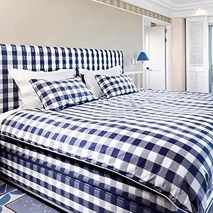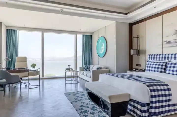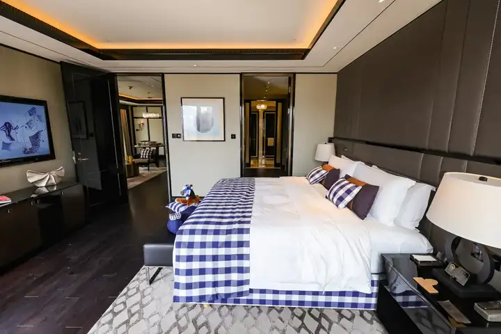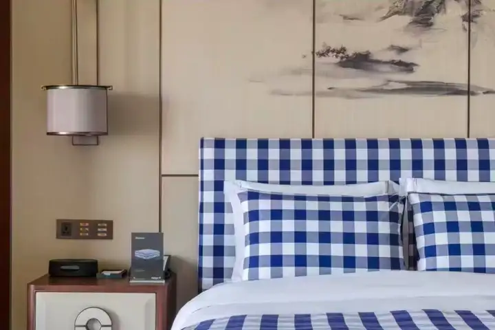 鹏瑞莱佛士酒店,海丝腾主题客房:素雅空间中,蓝白格Herlewing床,三套互动式弹簧系统、38层高品质天然材料,温柔承托每寸肌理;睡眠,自成一场身体的诗意舒展。
